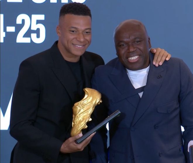 雷速体育10月31日讯 姆巴佩今天领取了上赛季的欧洲金靴奖,上赛季姆巴佩在西甲打进31球,在欧洲金靴的积分排名中以62分名列榜首。哲凯赖什虽然打进39球,但葡超进球系数为1.5,所以他以58.5分屈居第二。在领奖后,姆巴佩发表了获奖感言。